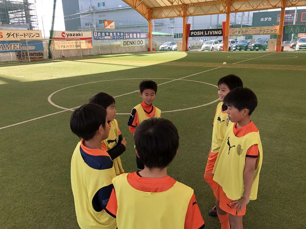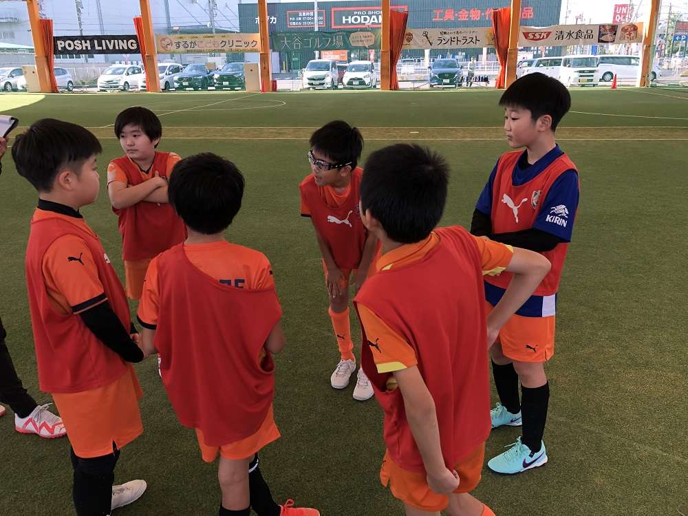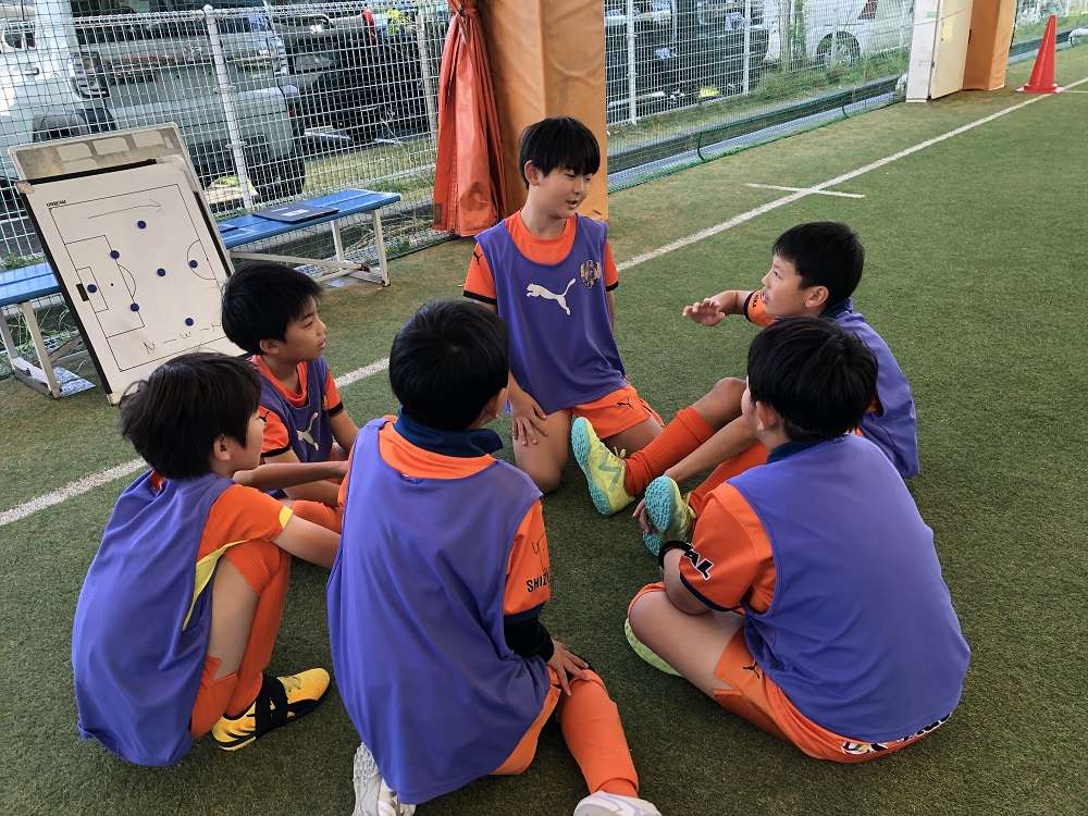 序盤は子どもたち皆、慣れない広いピッチに苦戦していましたが、休憩中にチームで話し合い、どのように攻めるかやポジションの確認などを行い、次の試合に挑む子どもたち。