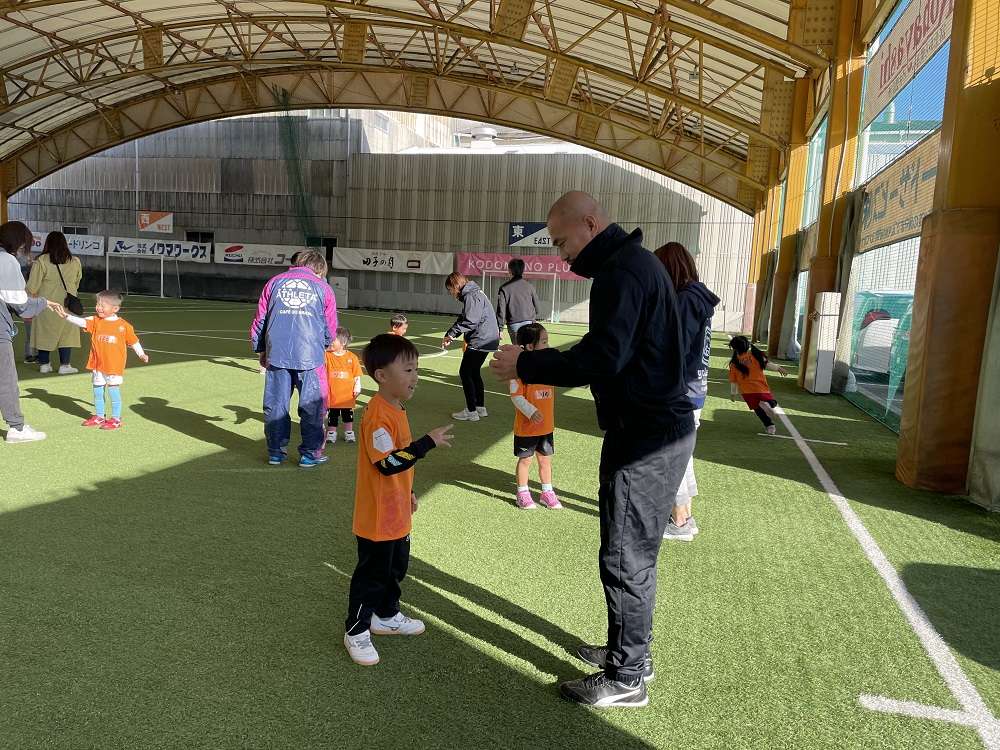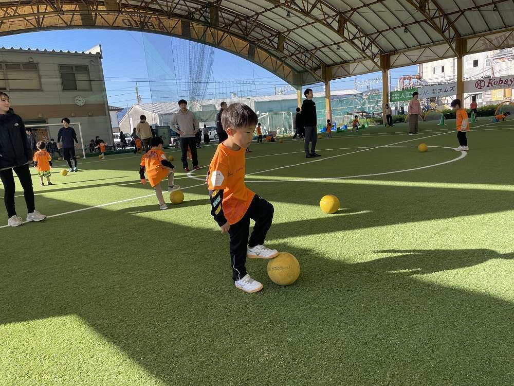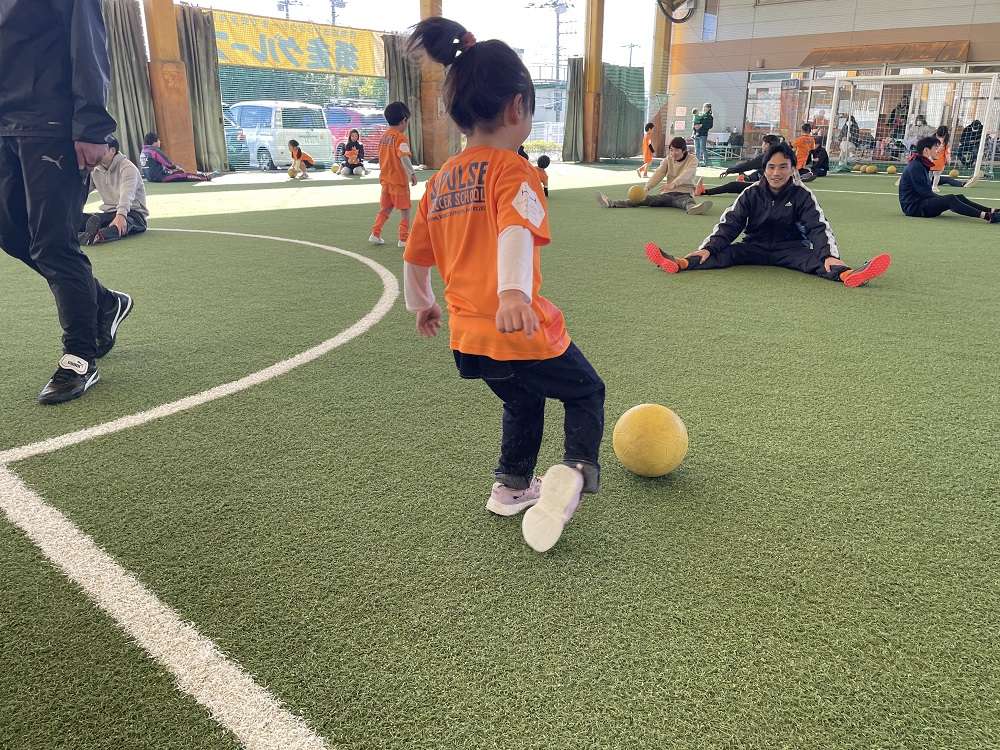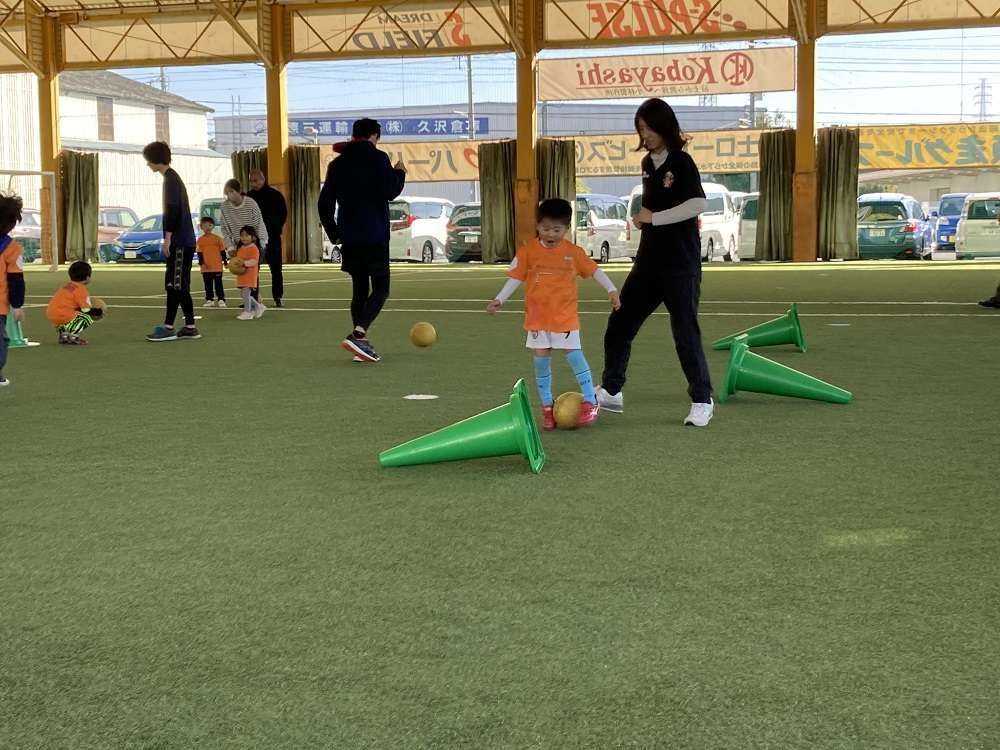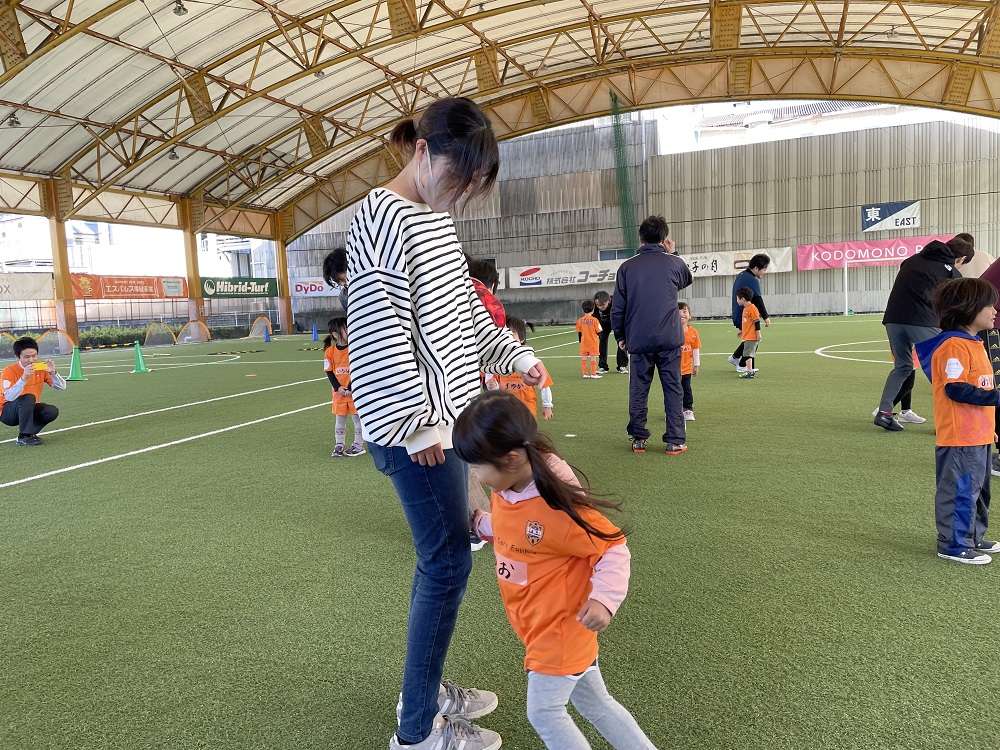 親子で行う体操や動きづくりに始まり、親子で手を繋いでドリブルや、キックでパス、試合の前には様々シュートアトラクションを行い教室の最後には、試合を行い、終始笑顔あふれる教室となりました。