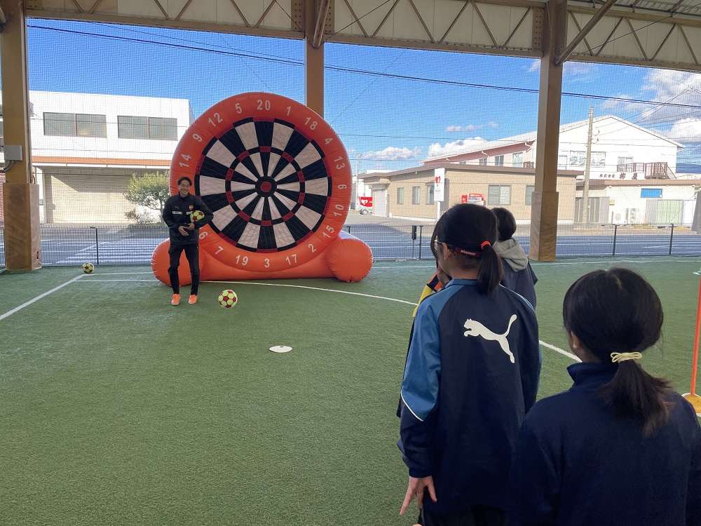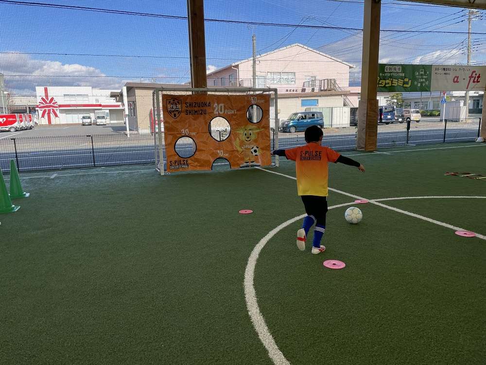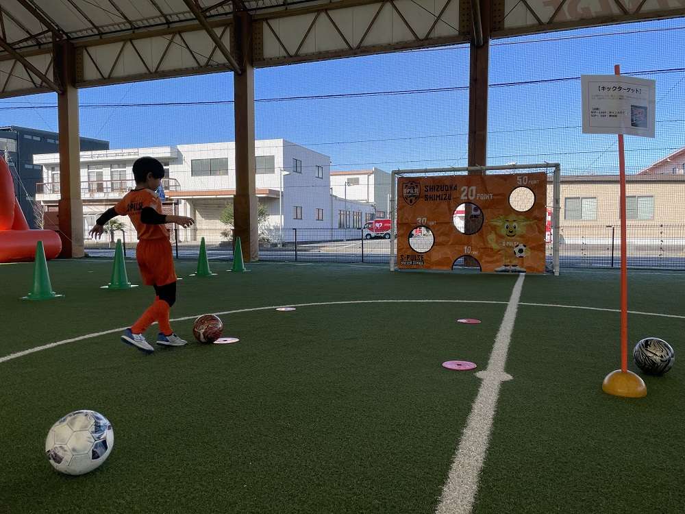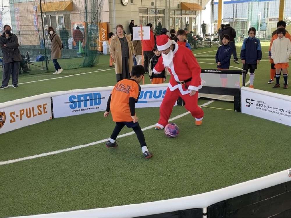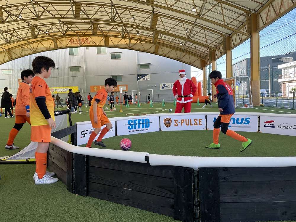 クリスマスソングが流れる会場にフットダーツ、キックターゲット、ストリートサッカーの3つのアトラクションと自由参加の試合コートを用意し、子どもたちには自由に楽しんでいただきました。