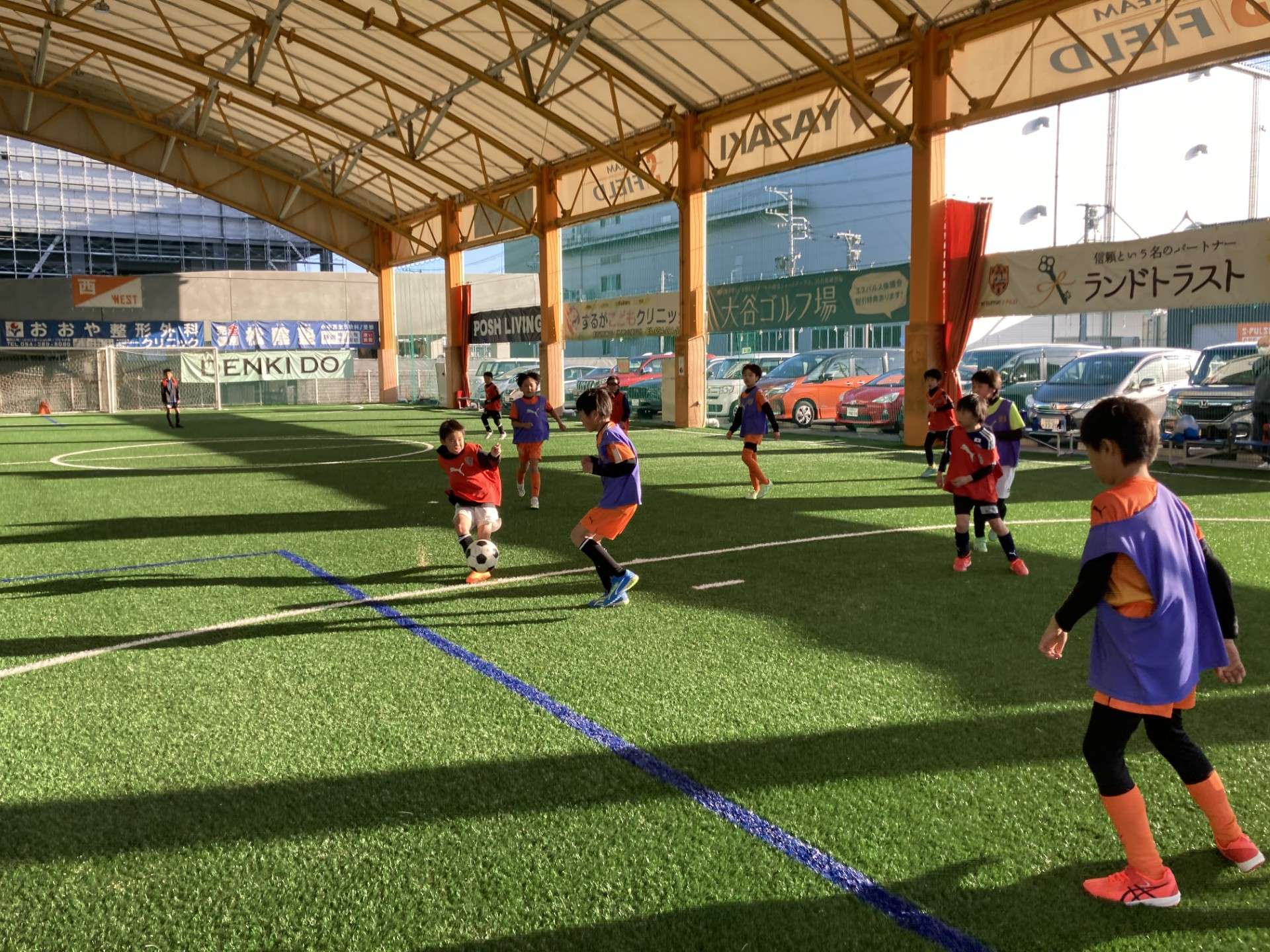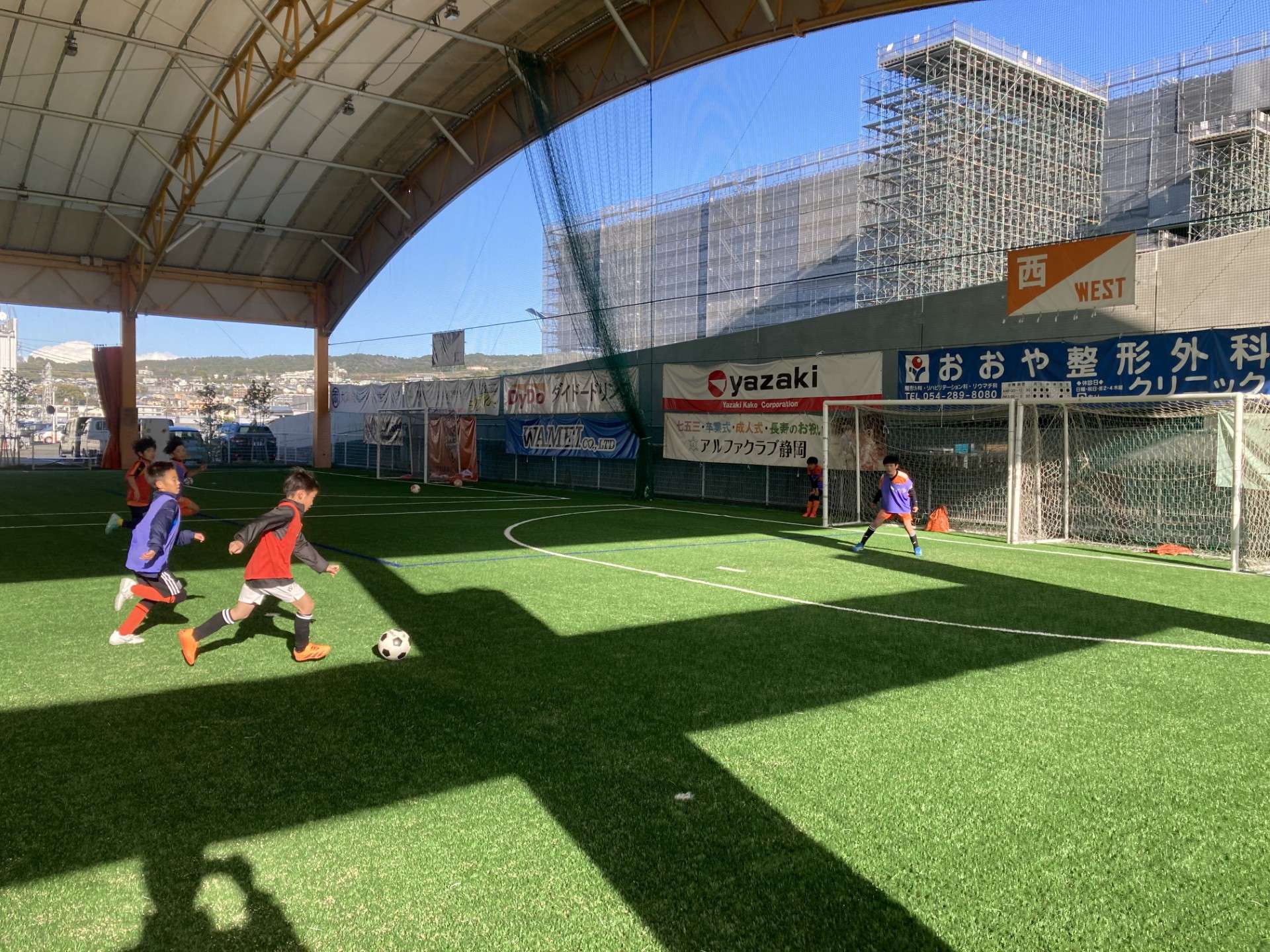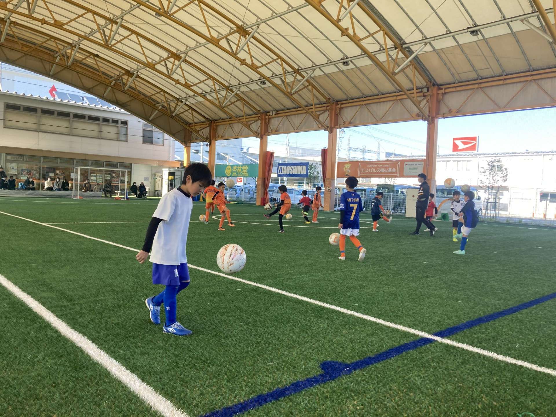 まず1・2年生はリフティングでボール・足の当てる位置やキックフォームの確認を行った後、かわしてシュートやコントロールシュートなどを行い、3・4年生はドリブルシュートでボールの置き所、踏み込みでシュートの基礎となる部分をトレーニング!