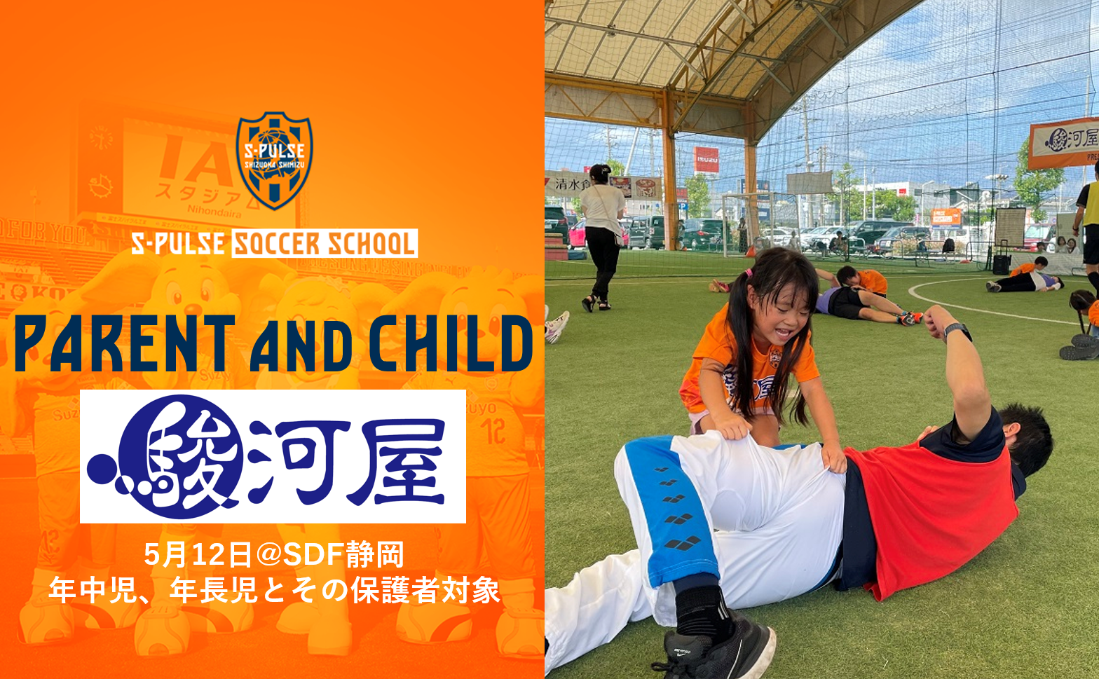 清水エスパルスは、地域事業応援パートナー 駿河屋(株式会社エーツー)様ご協力のもと、5月12日(日)にエスパルスドリームフィールド静岡にて、年中・年長児のお子さま1名と保護者1名の親子を対象とした『駿河屋 presents 親子サッカー教室』を開催いたします。