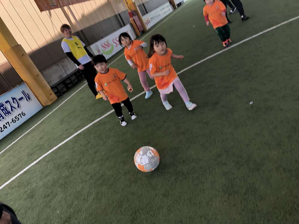 活動内容は、スキップなどの動きづくりから始まり、しっぽとり親子対決、手や全身を使ってのボールあそびへと進み、。その後、ドリブル、シュート、1対1、と行い、最後は試合で締めくくりました。
