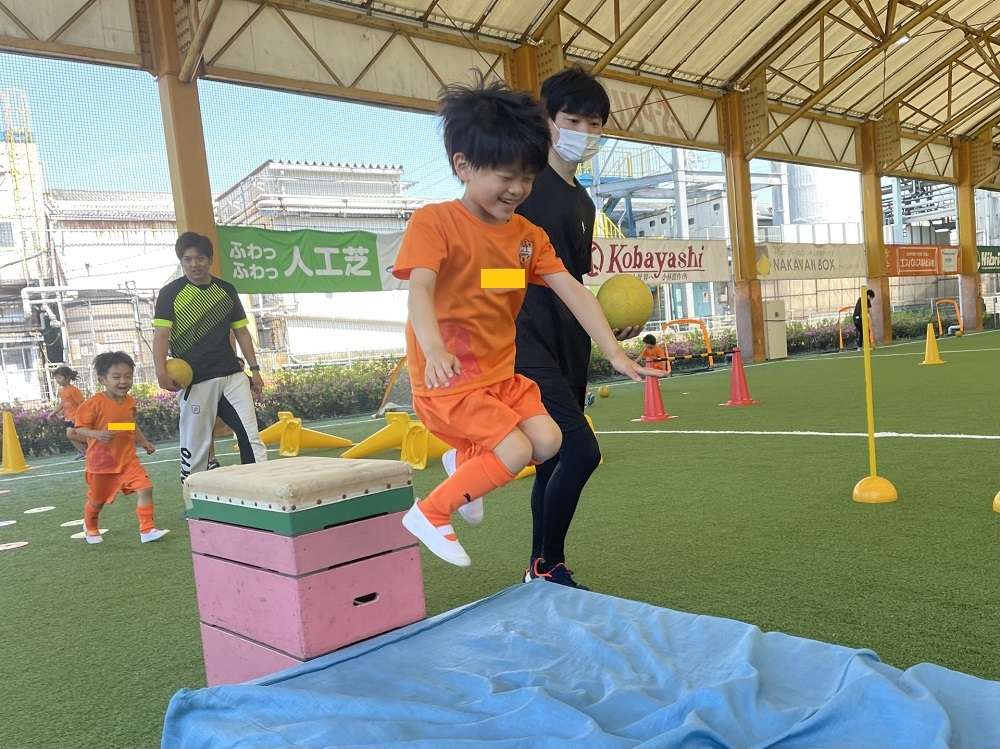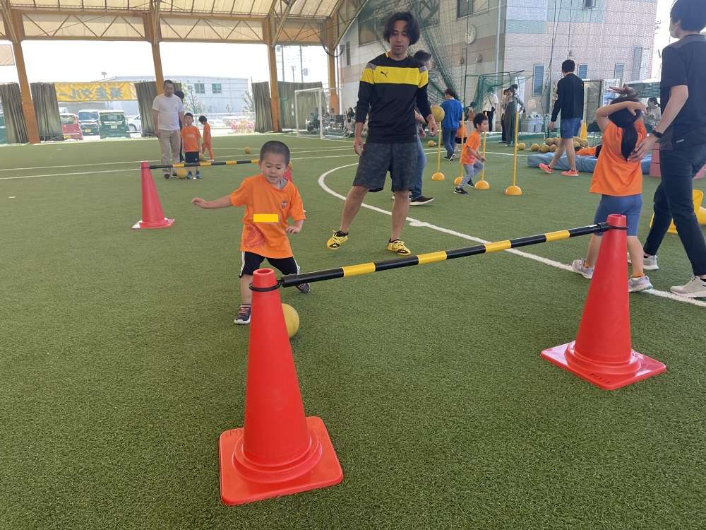 サーキットトレーニング。カラーコーンや障害物を親子で協力しながら攻略し、ゴールを奪うシュートトレーニングなどに取り組みました。