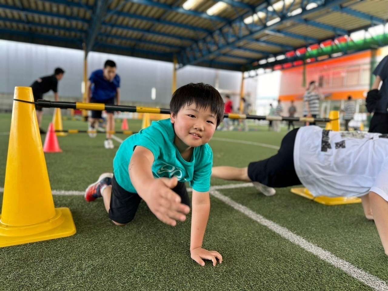 まずは、ウォーミングアップ!コーチの動きを真似したり、ボールを使った運動も行いました。空中にボールを投げ手を叩いてキャッチなどを行いましたがみんなとても上手に出来ていました!その後、サーキットトレーニングも行いました。コーンの上をジャンプやくぐるなど、たくさんの動きをしました。