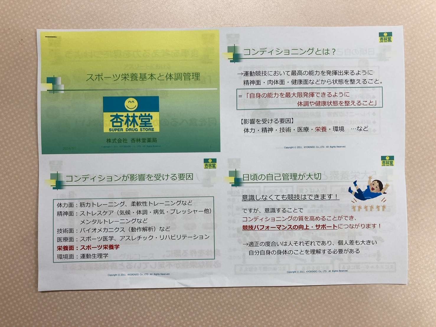 今回、今夏の広島遠征に株式会社杏林堂薬局様のサポートをいただく関係で、広島遠征に参加するスクール生を対象に実施。当日は、杏林堂薬局様管理栄養士の酒井英彰様に講師をしていただき、スクール生および保護者様が参加しました。
