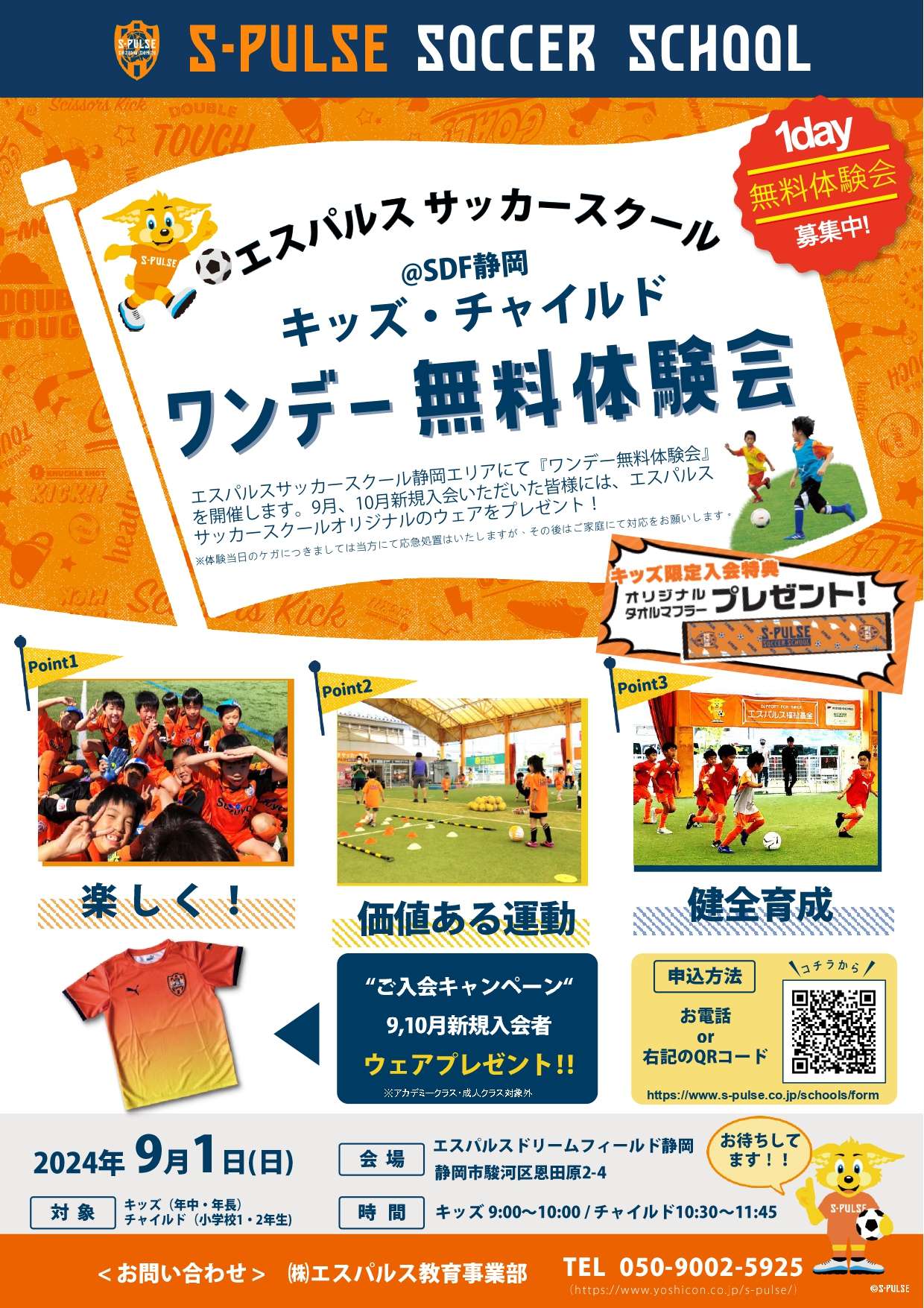 清水エスパルスは、9月1日(日)にエスパルスドリームフィールド静岡にて、年中、年長児のお子様と小学1年生、2年生を対象とした『ワンデー無料体験会』を開催いたします。