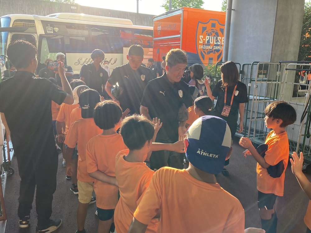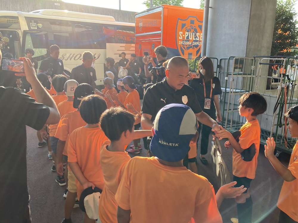 秋葉監督を先頭に、トップチームのコーチ、そして選手達が次々にバスから降りてきました!そして、たくさんの選手とハイタッチしました!