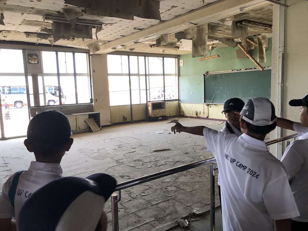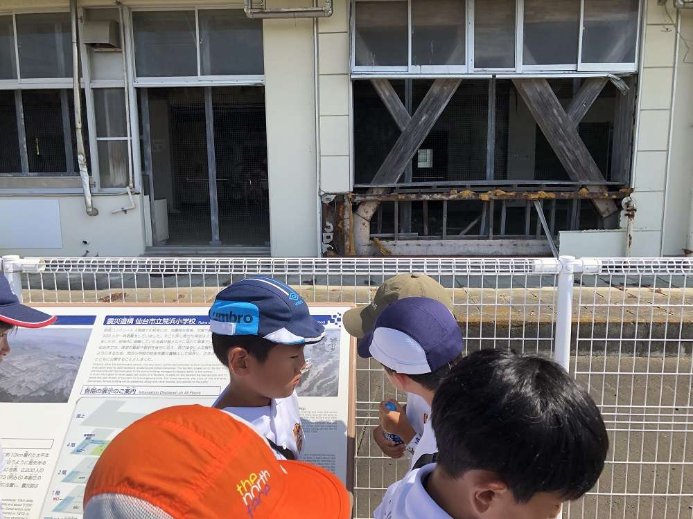 まずは被災地見学に向かいます。到着したのは『荒浜小学校』です。この小学校は、東日本大震災の時に被災した海に近い小学校です。小学生や地域住民がこの小学校に逃げて命が救われました。周りの家はすべて流されてしまいましたが、この荒浜小学校だけは流されずに残りました。学校の1階と2階は震災当時のまま残されていて、リアルな津波の怖さを見学することができます。3階は防災のことを学べるようになっており、また震災等のことを映像でも見ることができます。映像を見て、被災した方の大変さに涙を流すスクール生もいました。テレビや新聞では感じることができない、様々な事を現地にきて感じているようでした。