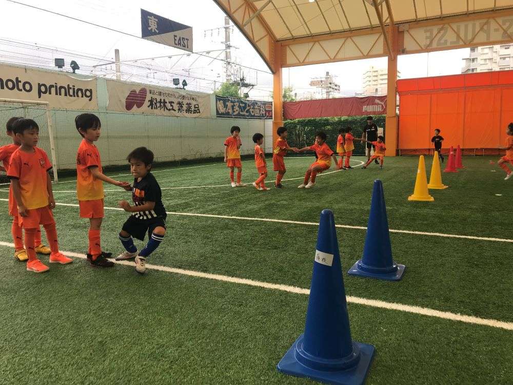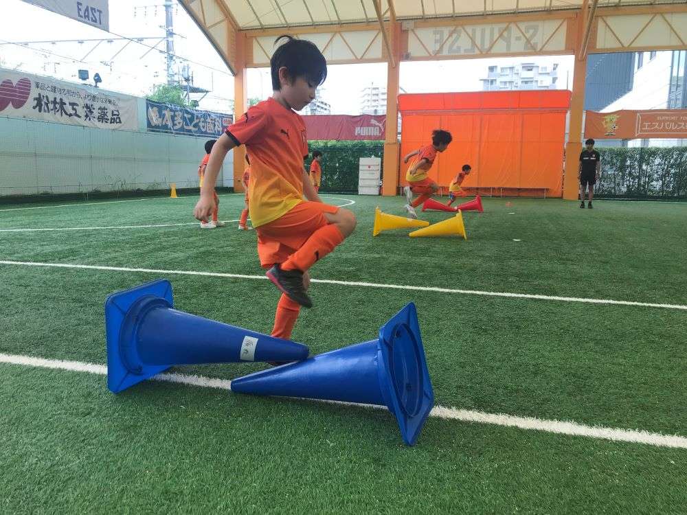 1~2年生のウォーミングアップです!コーンの上をジャンプからのダッシュや、後ろの人とタッチからダッシュといったステップワークを行いました。