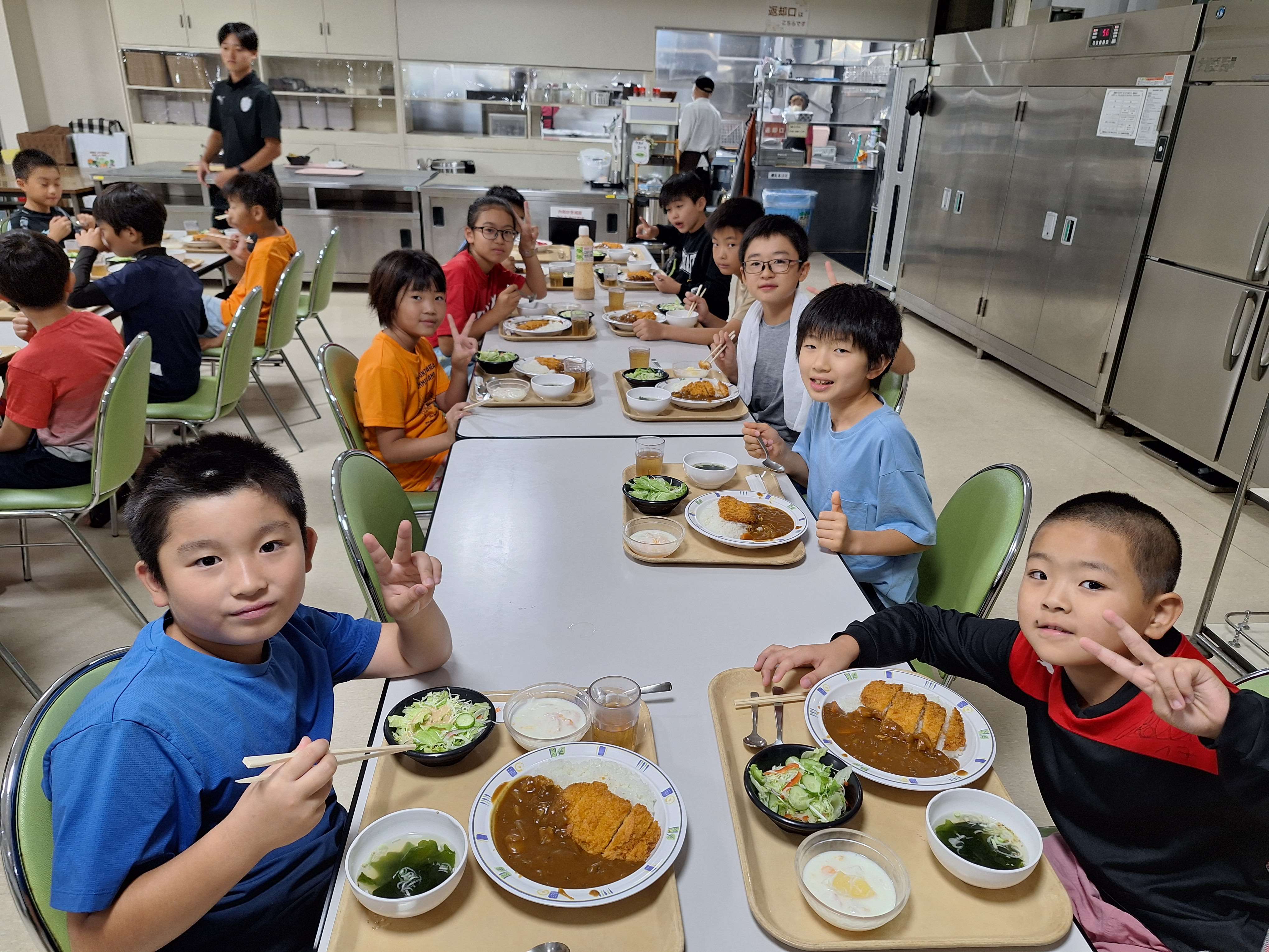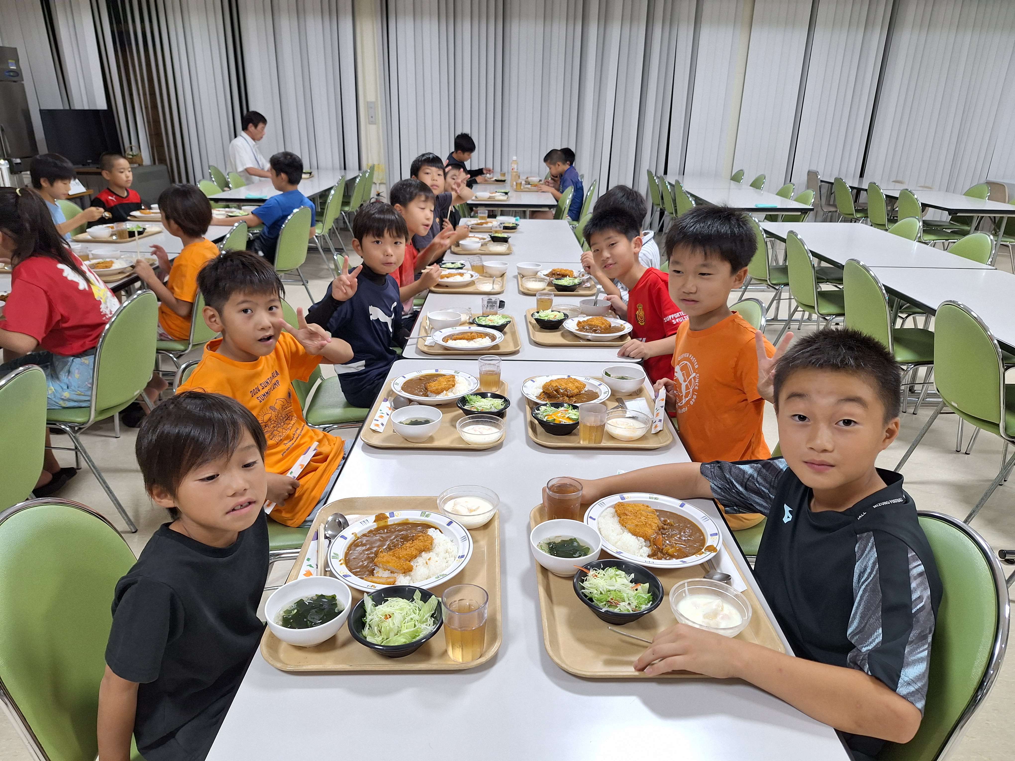 入浴後、お待ちかねの夕食!メニューはカツカレー!!なかにはおかわりをしていた子も!!明日に向けて、エネルギーを蓄えます。