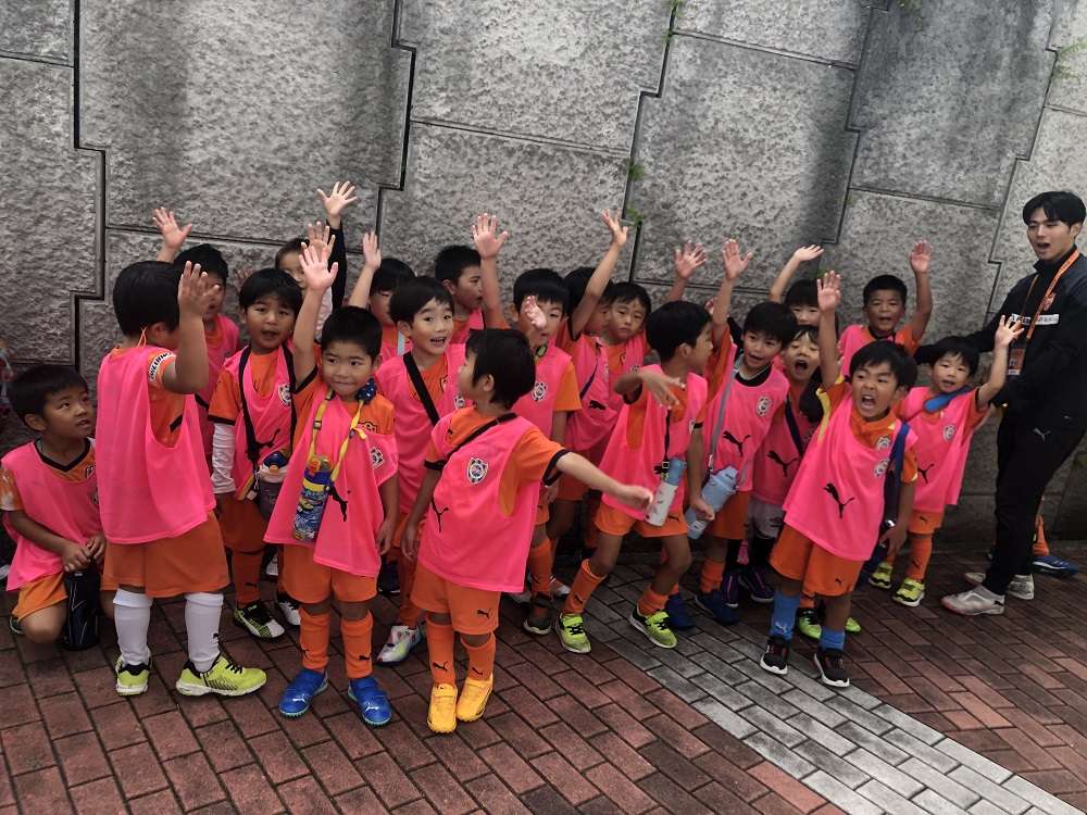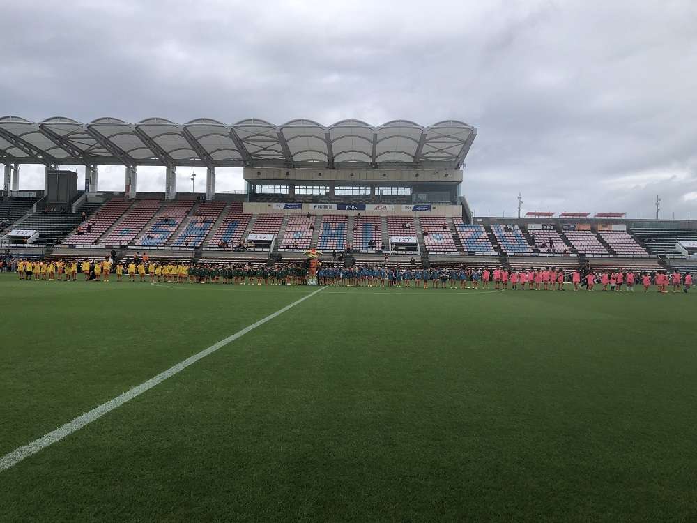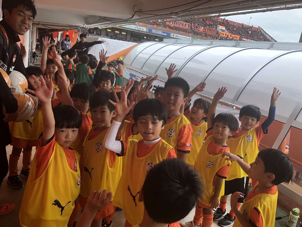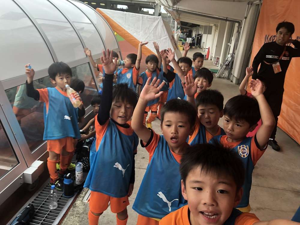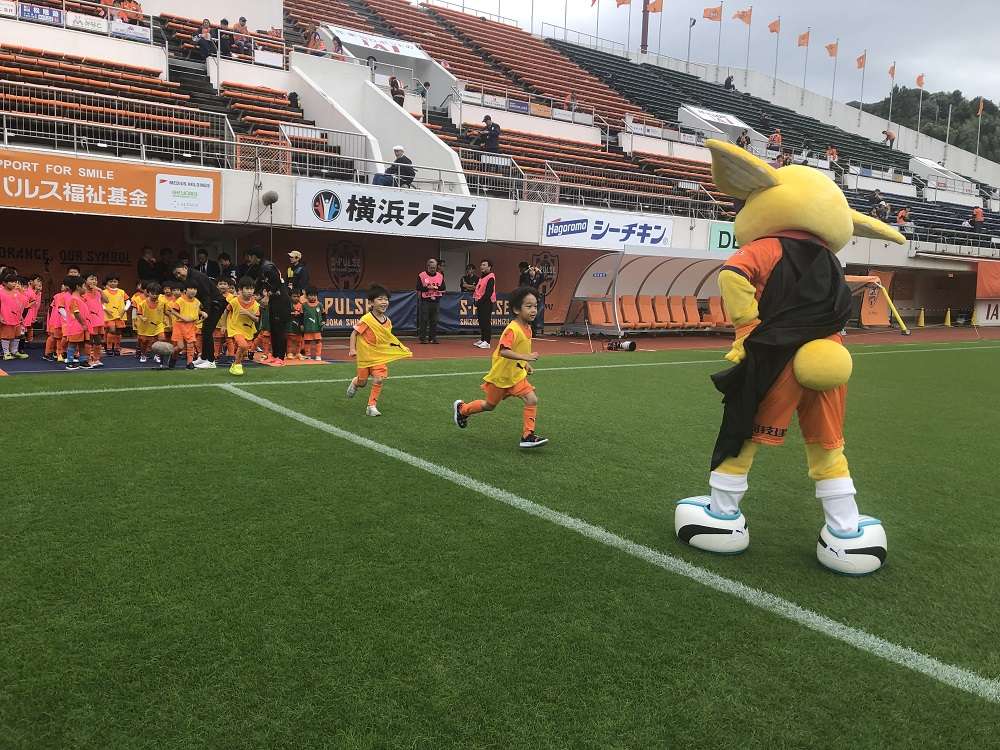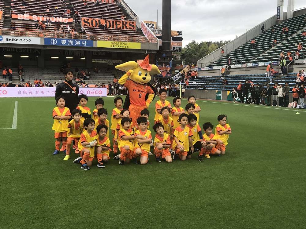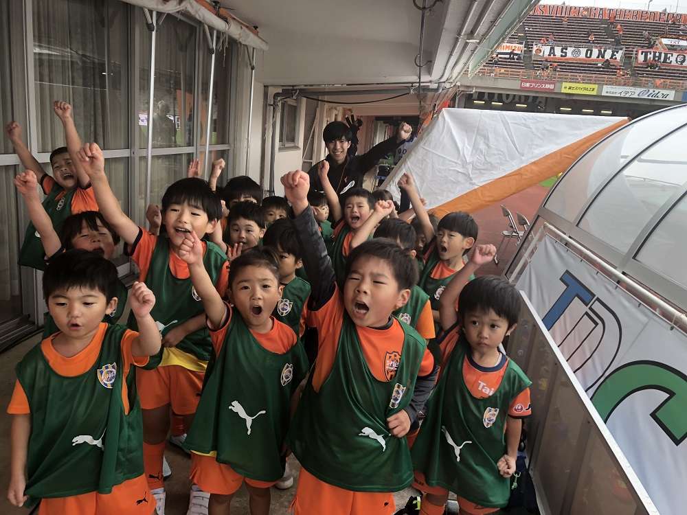 TOPチームは勝利すればJ1昇格が決まる試合、その前座!スタジアムはいつもの熱気とともに若干の緊張感も漂っていたようにも感じました。そこに元気いっぱいのスマイルとパワーを持ち込んだキッズクラスの子どもたち!