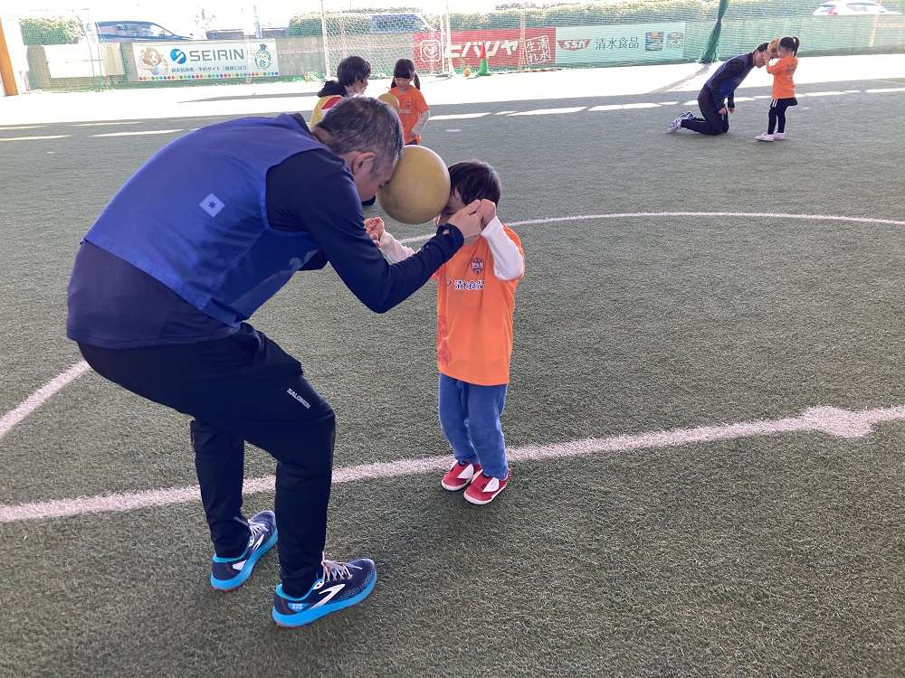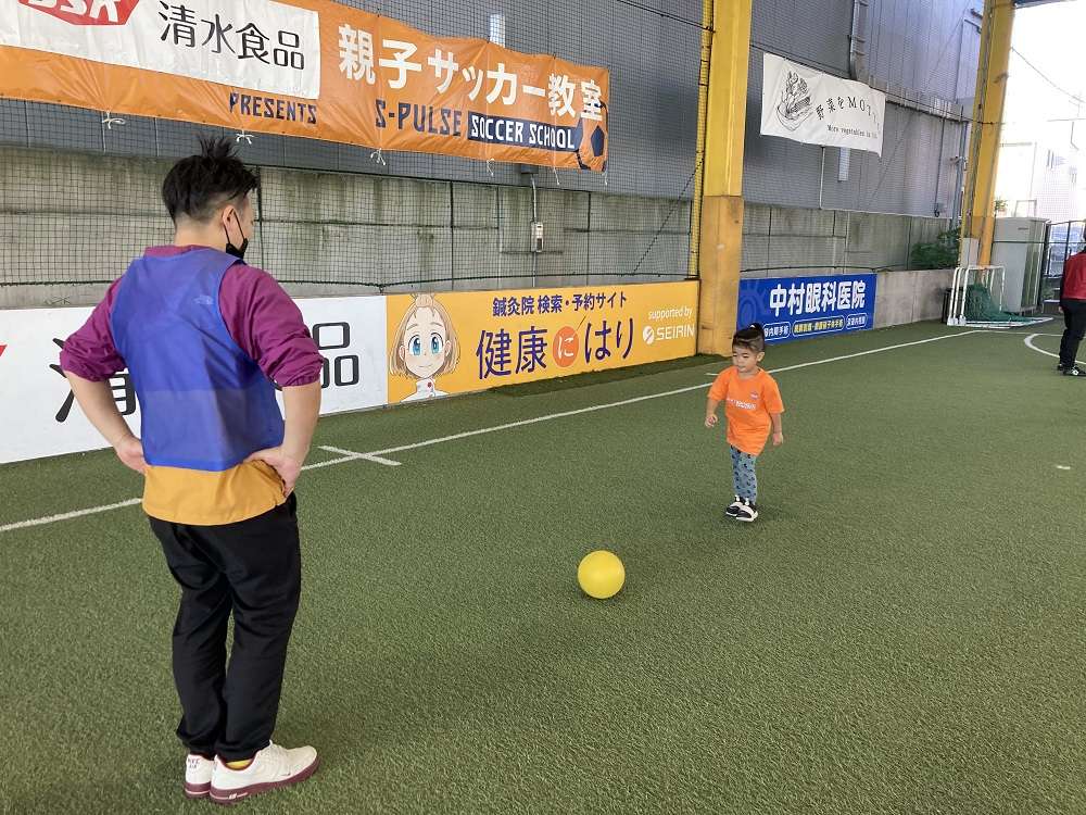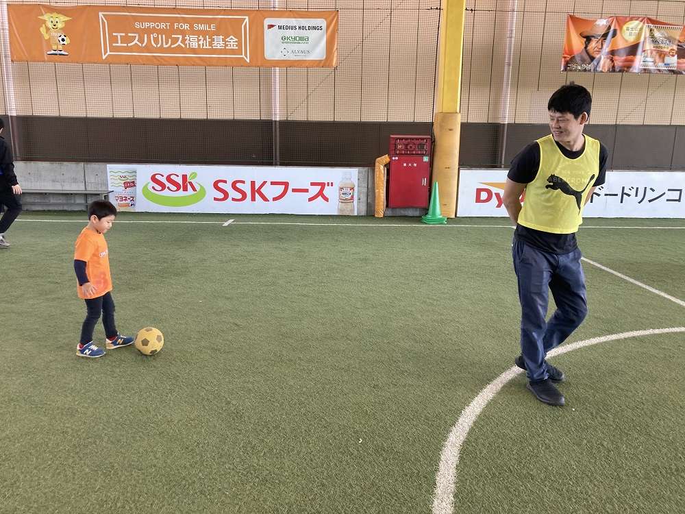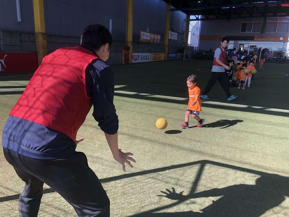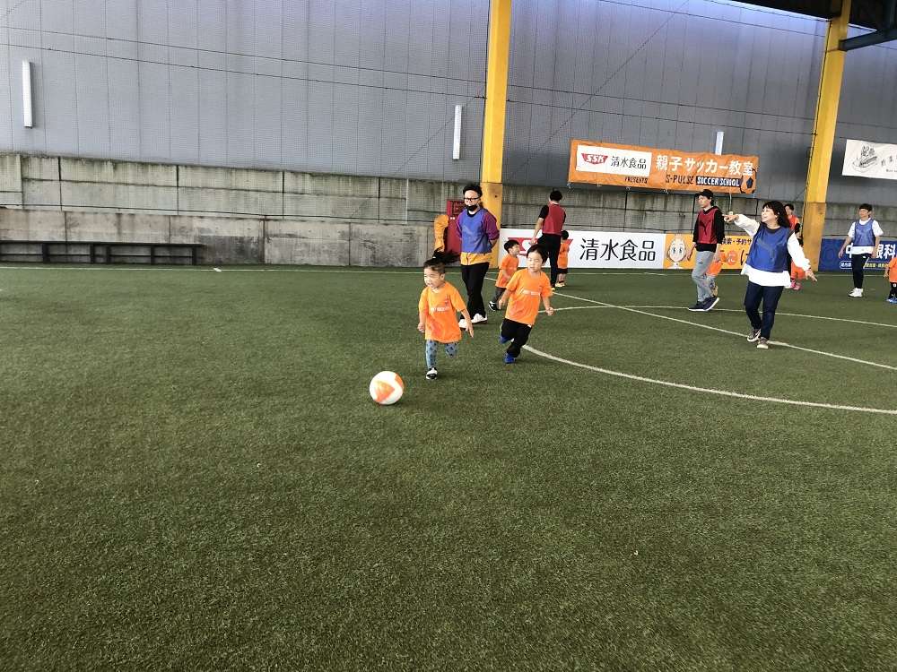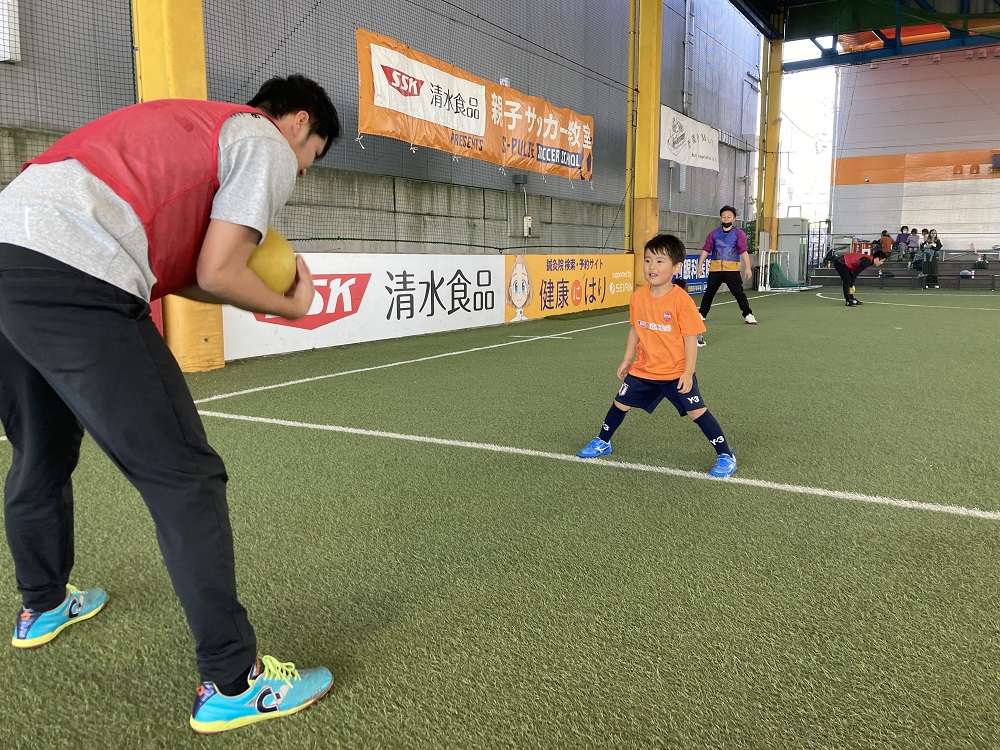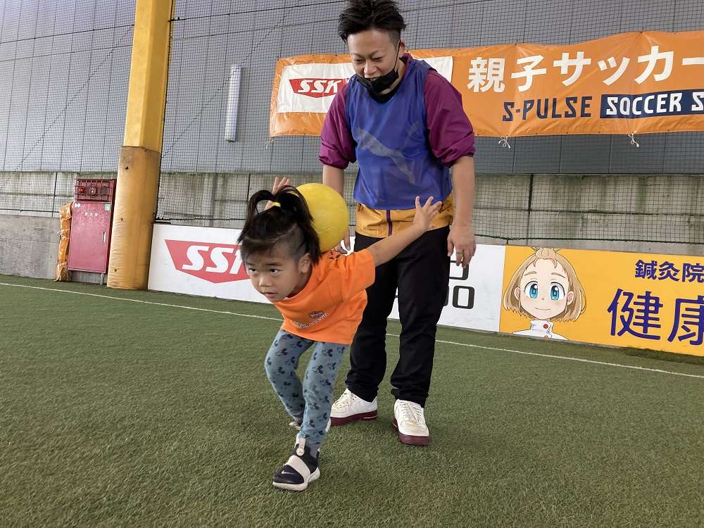 足を使ったボール遊びにもチャレンジ!ドリブルやパスを行い、最後は、親子でボール奪い対決も!