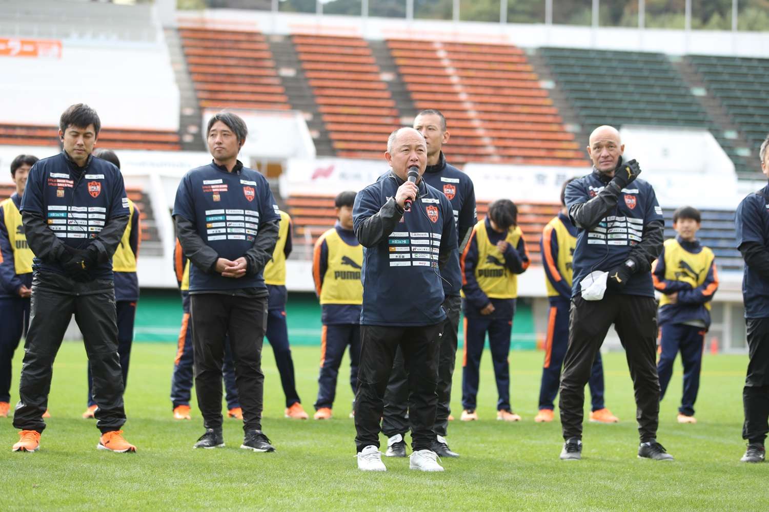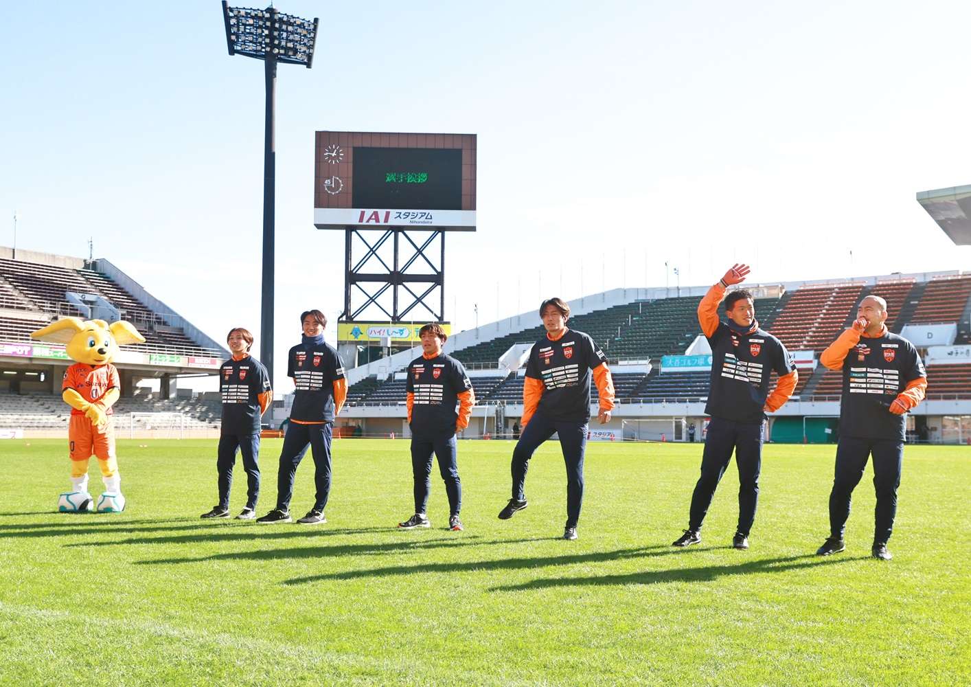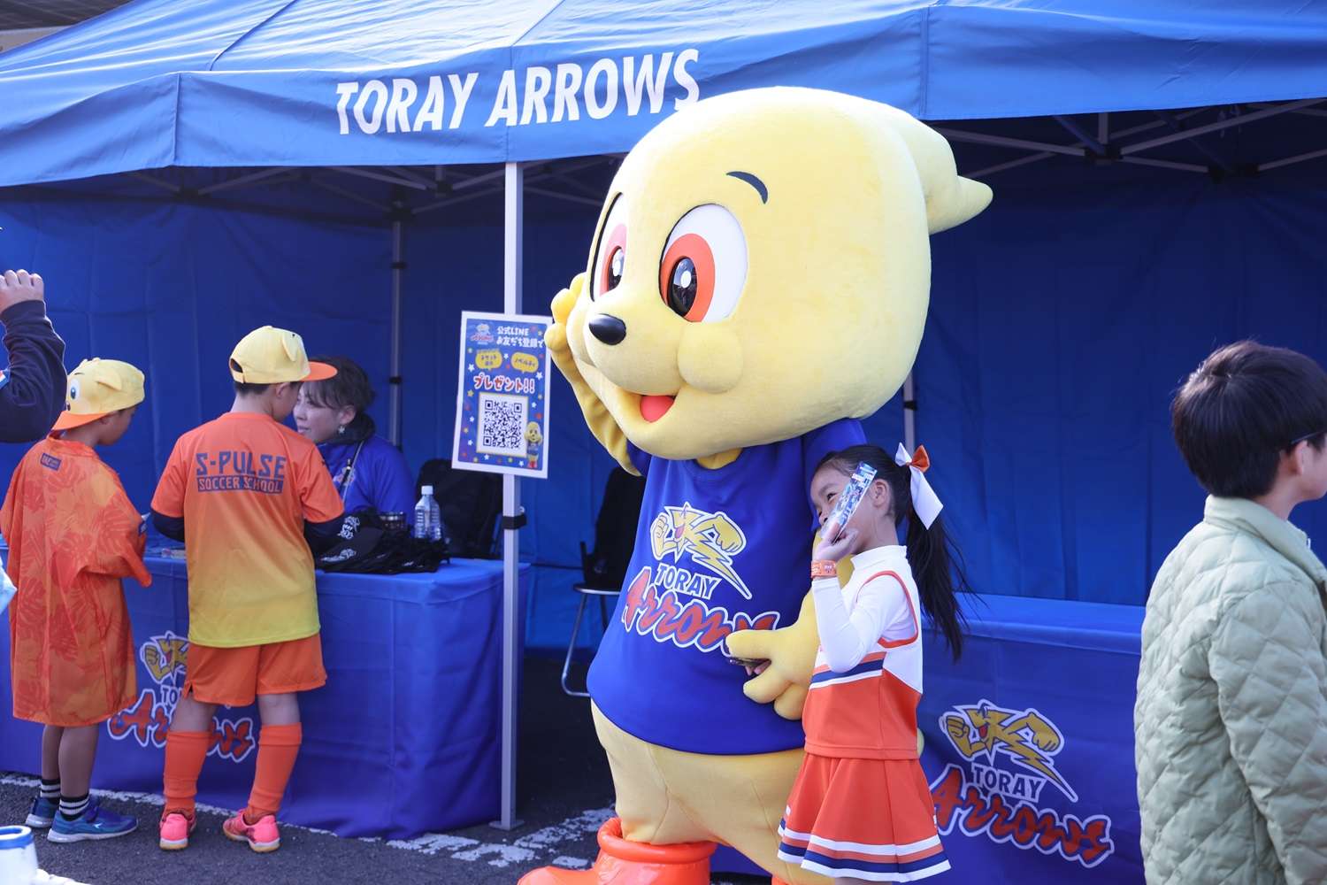エスパルスダンスクールのオープニングアクト、スクールコーチ紹介、今泉HoCのあいさつと続き、ヤクルトマン『ゼッコー腸ダンス』を踊って準備体操しました。