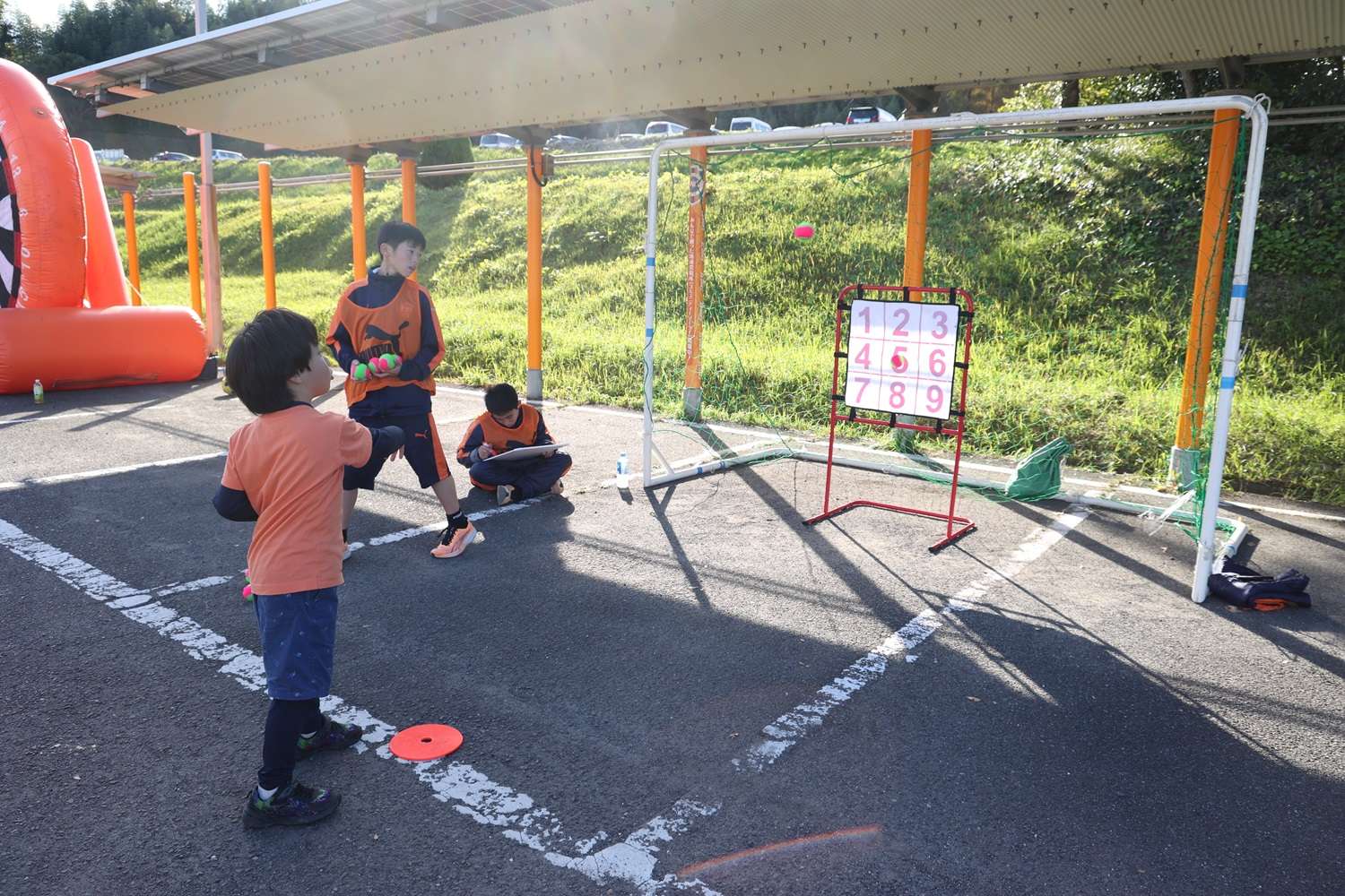 『田子の月もなかスポーツパーク』と題して、様々なスポーツアトラクション(9種類)を実施。たくさんの親子に「富士山頂キング」「フットダーツ」「ストリートサッカー」「ウォーキングフットボール」「フットボーリング」「スピードキング」の6つのサッカーアトラクションと、東レアローズ静岡バレーボール様にご協力いただいた「バレーボールサーブチャレンジ」「ラグビーパス競争」「ストラックアウト(野球)」の3つのスポーツアトラクションに親子で挑戦いただきました。親子や兄弟で対決したり、家族で協力してクリアに向けて楽しくチャレンジして「お母さんには負けないぞ!」「さすがお父さん!」「やったー!僕の勝ち!」という声が様々なところで聞こえ家族みんなで楽しんでいる姿が見られました。