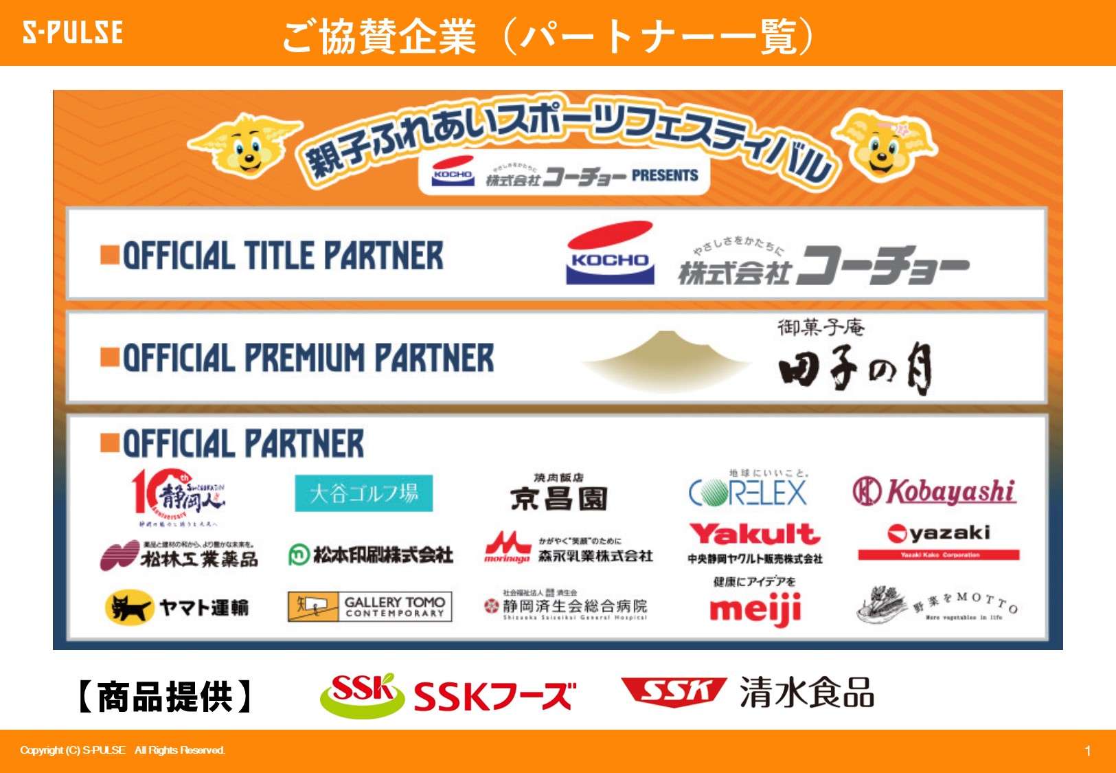 今回のイベントはタイトルパートナー 株式会社コーチョー様、プレミアムパートナー 株式会社田子の月様、また協賛パートナーとして、株式会社エスクリエイト(静岡人)様、株式会社小林製作所様、森永乳業株式会社様、株式会社グリーンマスターズ清水(大谷ゴルフ場)様、社会福祉法人恩賜財団 静岡済生会総合病院様、モンマルシェ株式会社様、GALLERY TOMO様、松林工業薬品株式会社様、中央静岡ヤクルト販売株式会社様、焼肉飯店京昌園様、松本印刷株式会社様、ヤマト運輸株式会社静岡主管支店様、コアレックス信栄株式会社様、株式会社 明治様、矢崎化工株式会社様。商品提供パートナーとして、エスエスケイフーズ株式会社様、清水食品株式会社様よりご支援をいただきました。
