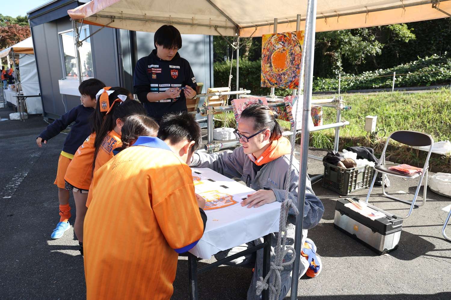 また午後からは、トップチームから、吉田豊選手、北川航也選手、原輝綺選手、山原怜音選手、成岡輝瑠選手、梅田透吾選手が参加しました。各イベントエリアで子どもたちと一緒に楽しんで盛り上げてくれました。参加者も憧れの選手を身近に感じて喜びいっぱいで各イベントを楽しんでいました。