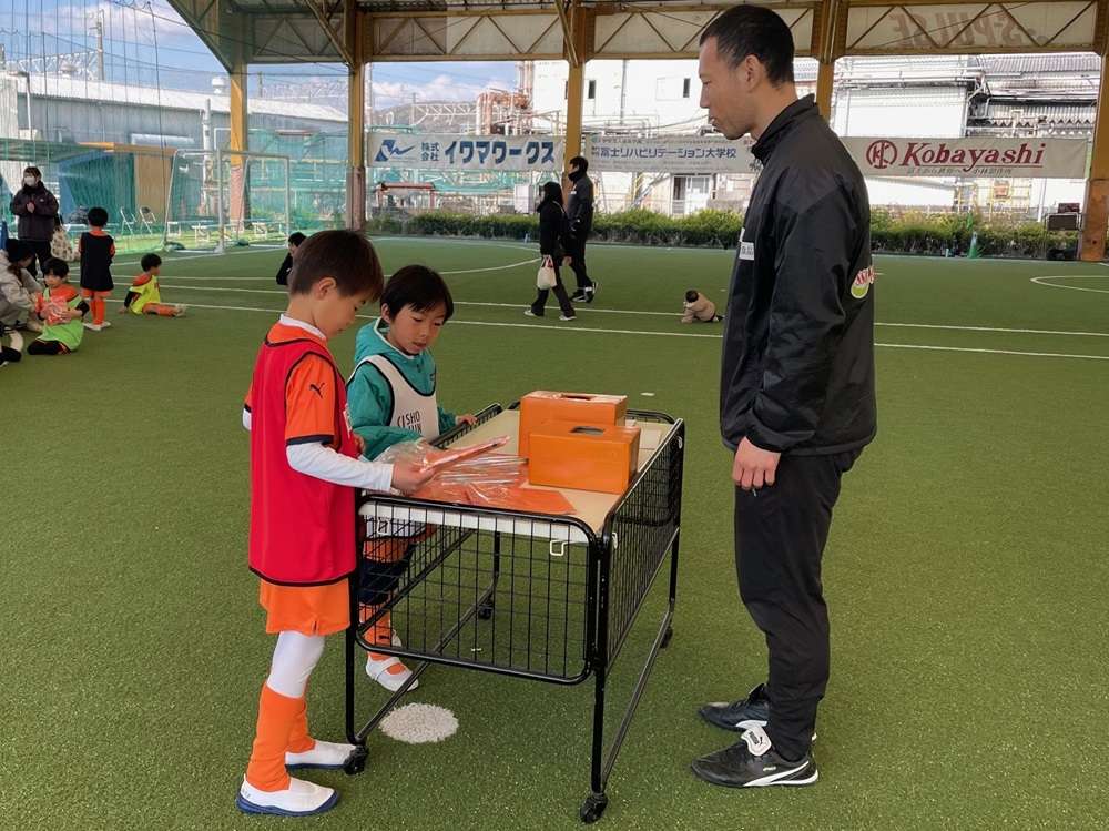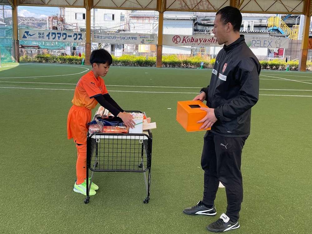 試合を終えた後は、全員プレゼントのお楽しみ、抽選会。お目当てのエスパルスグッズを前に、ソワソワしながら、名前が呼ばれるのを待つスクール生。ユニフォームやスクール限定の景品などをゲットした子ども達の嬉しそうな表情を見ることができました。