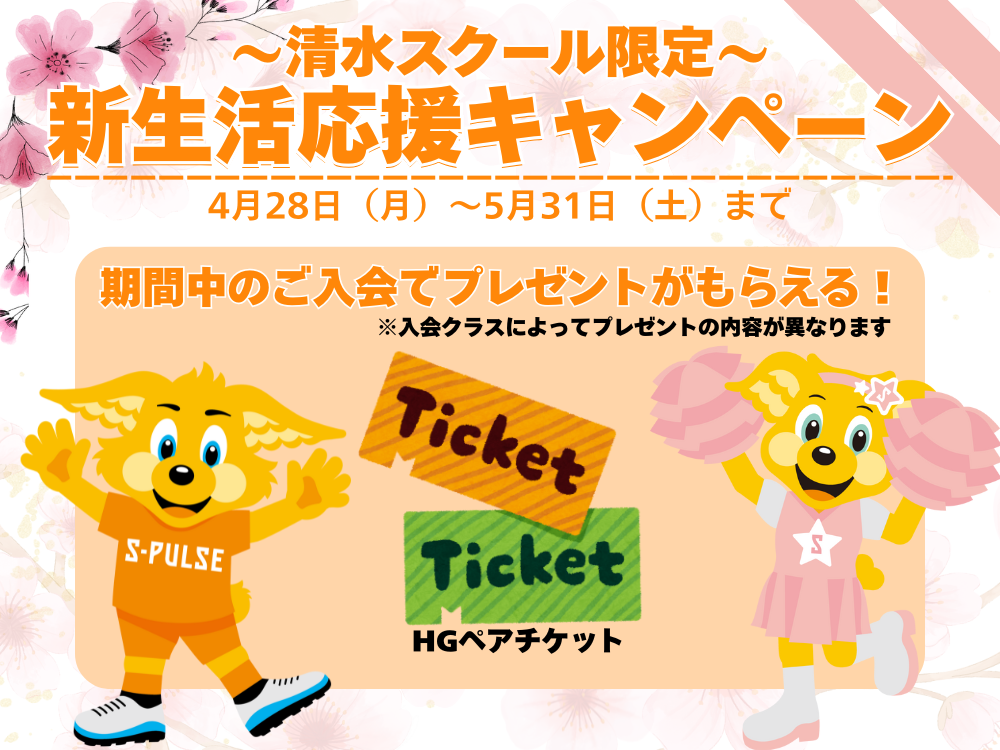 キャンペーン期間内に5月入会をされた新規入会者全員にエスパルスホームゲーム観戦チケット(親子ペア)贈呈