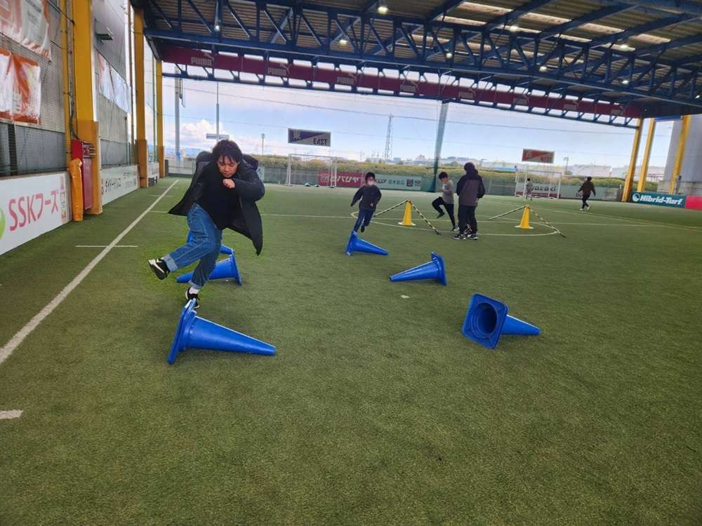 まずは、ウォーミングアップ!コーチのまねっこ動きをしたり、サーキットトレーニングも行いました。コーンやバーの上をジャンプやマーカーから落ちないようにジャンプなど、たくさんの動きをしました。