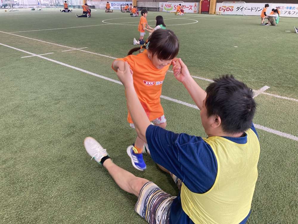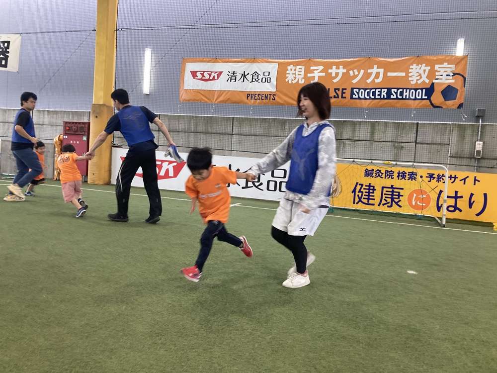 手を繋いでジョギングやお父さん、お母さんの足の上をジャンプ、ビブスを使ってキャッチボールなども行いました。