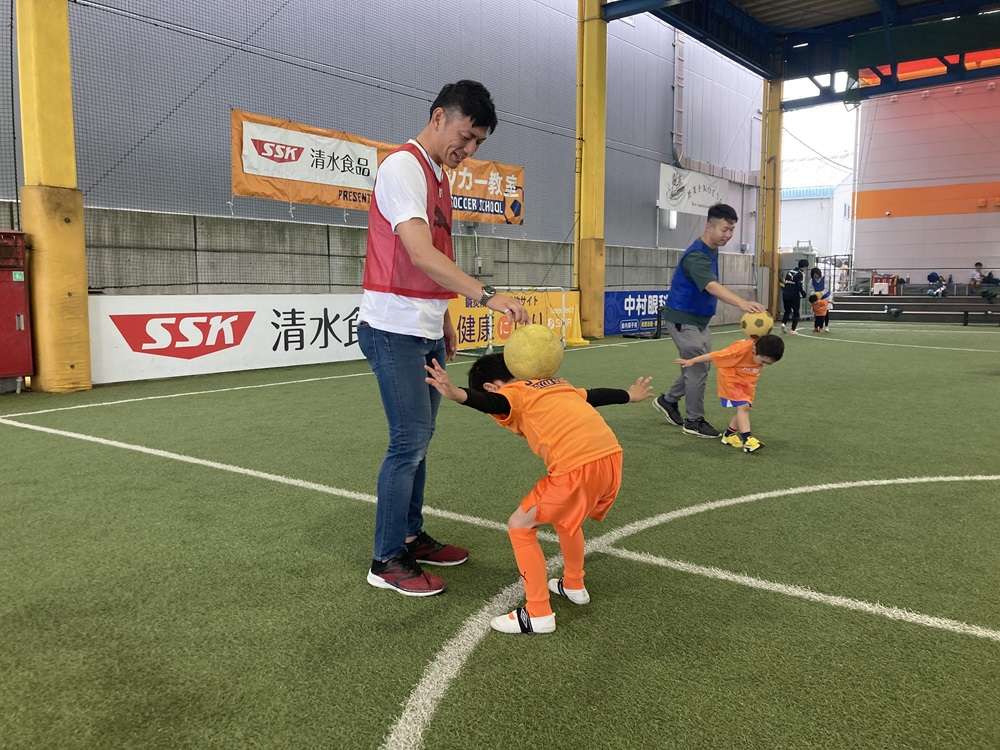足を使ったボール遊びにもチャレンジ!ドリブルやパスを行い、最後は、親子でボール奪い対決も!