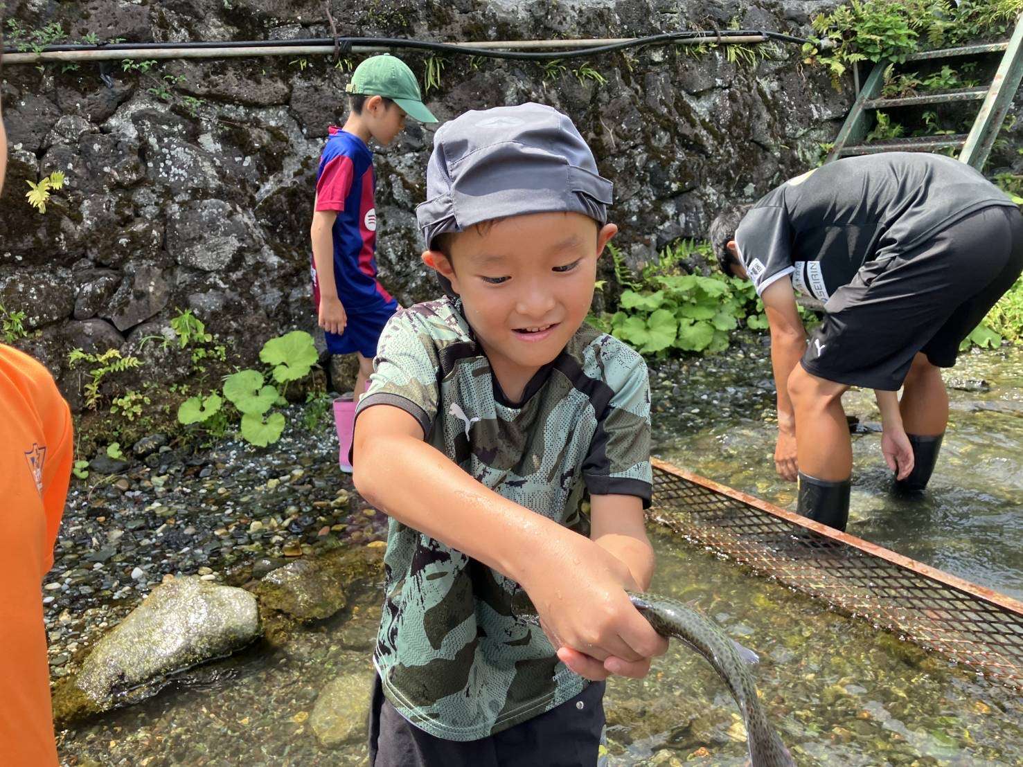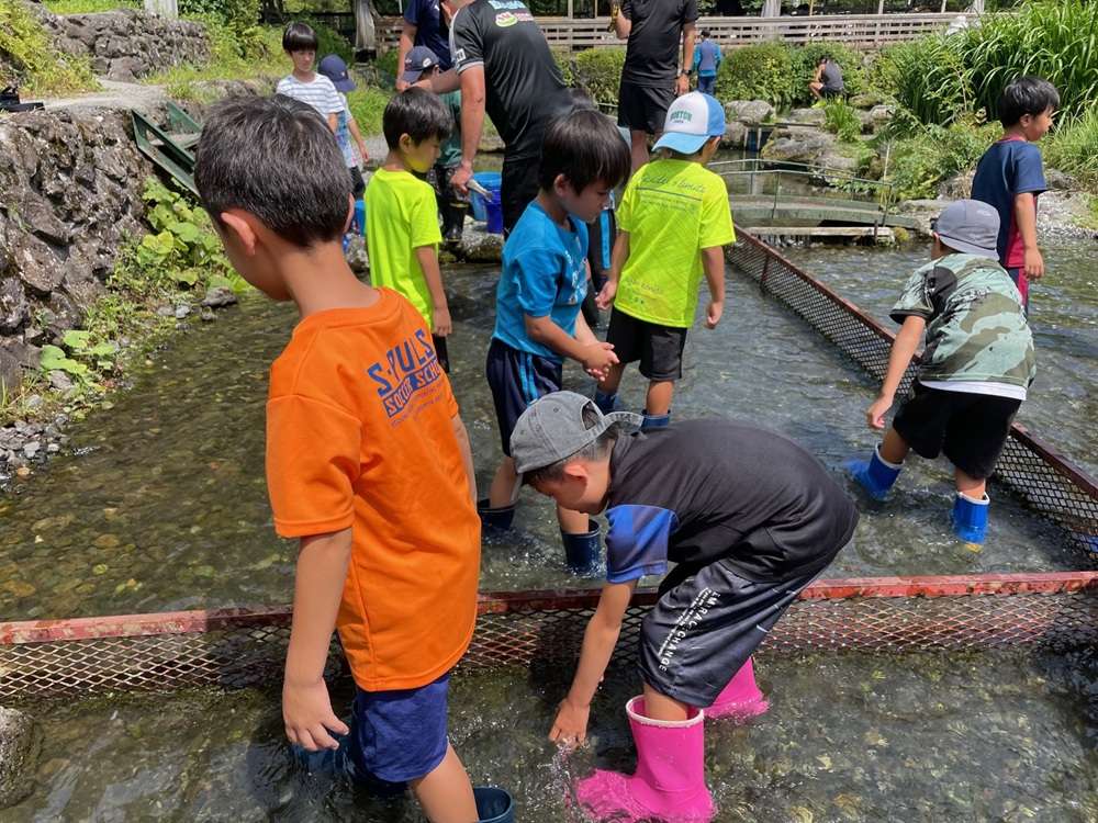 富士山上流の冷たい水に足を入れ、素早く動く魚に苦戦しながらも全員が