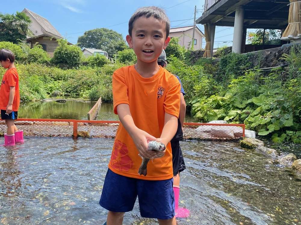 サッカーで汗を流した後は、ニジマスのつかみ取りに挑戦!