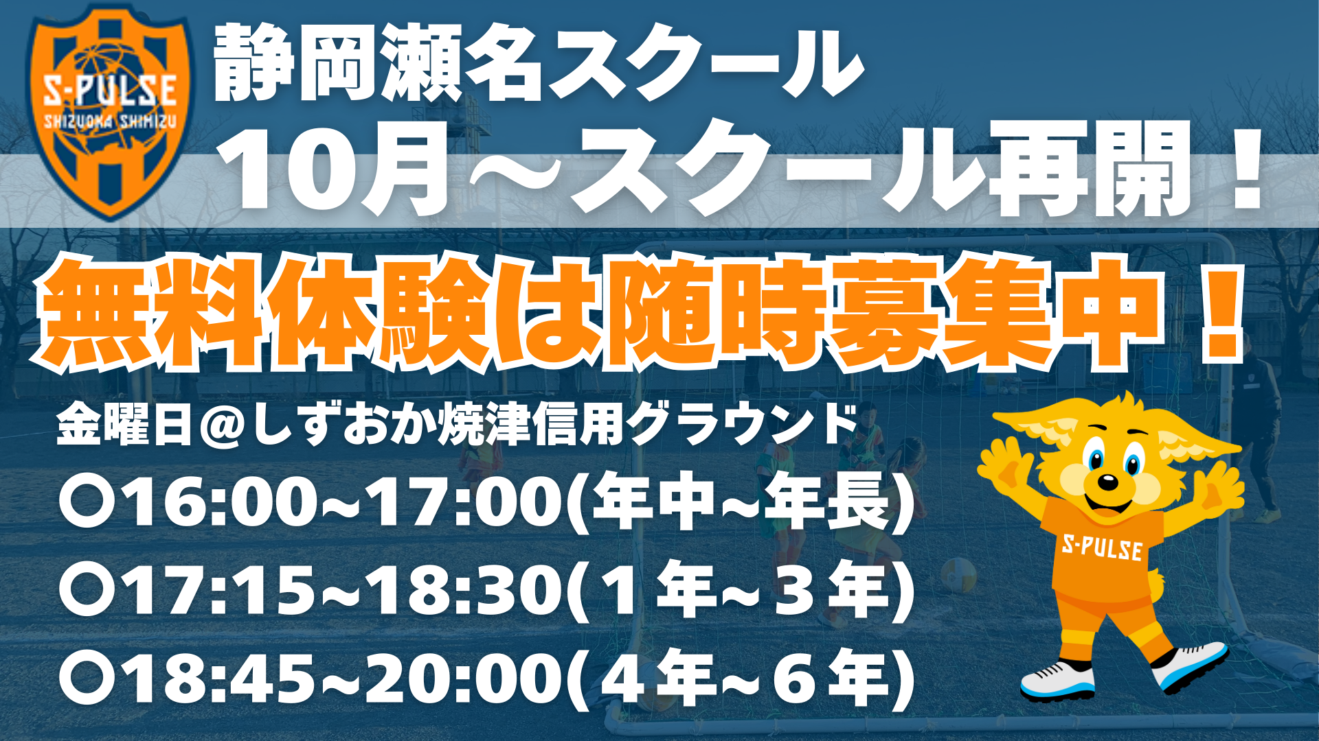この度、エスパルスサッカースクール清水では10月より毎週金曜日に「静岡瀬名スクール」を再開することとなりました。