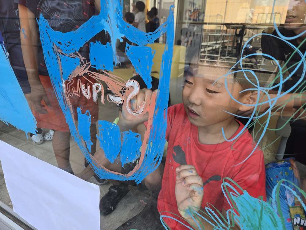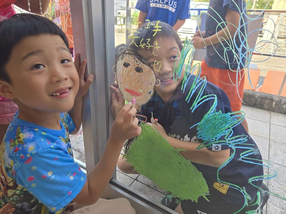午前中に計画した絵を窓に描きます!クレヨンでいいの?って思う子どもたちがたくさん!大丈夫なんです!窓に書いても消せるクレヨンなんです!
