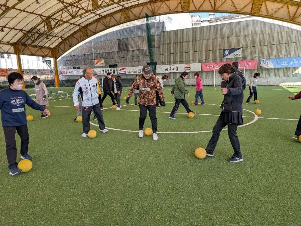 その後、ボールを使った様々な運動を体験していただき、最後は皆さんが楽しみにしておられた「ウォーキングフットボール」です。