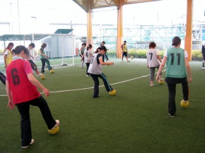 まずグラウンドで実技を行ううえで、先生たちの緊張をほぐすために「アイスブレイク」という仲間同士が打ち解けあうメニューを行い、その後に「動きづくり系」「鬼ごっこ系」「ボールフィーリング系」「ゲーム系」と4つに分類されたメニューを実施しました。