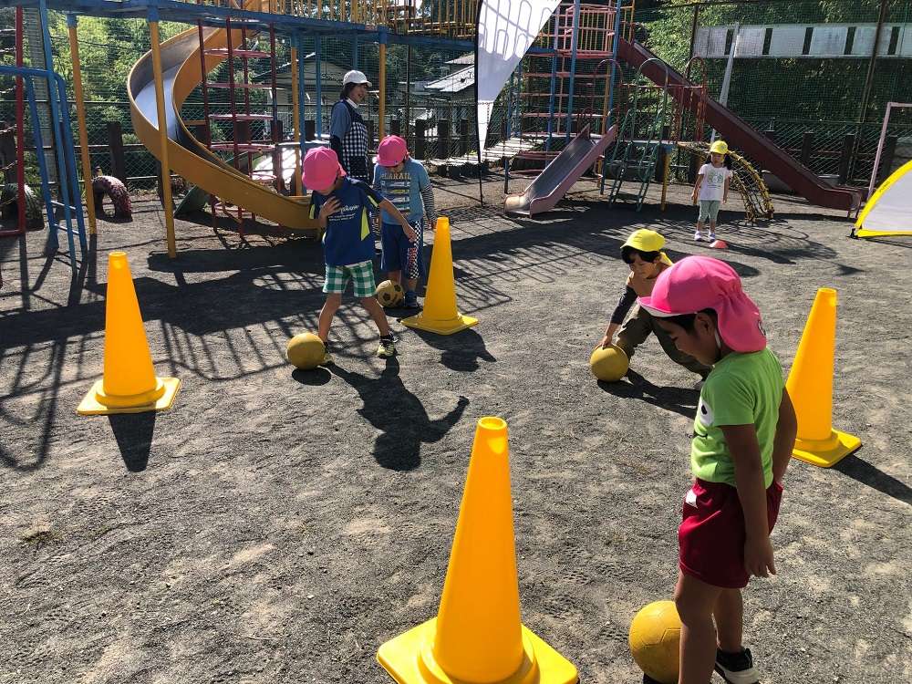 自然豊かな園で楽しく活動できました。ドリブル、シュート、試合と一生懸命にプレーしてくれました!